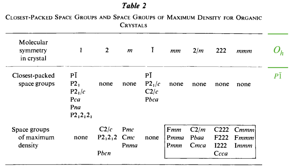 The truth is, we have been somewhat misleading. Thanks to A. I. Kitaigorodsky, we had a good estimate of the closest-packed space groups from the beginning. Below is a table from the book Molecular Crystals and Molecules by A. I. Kitaigorodsky, published in 1973, showing these.